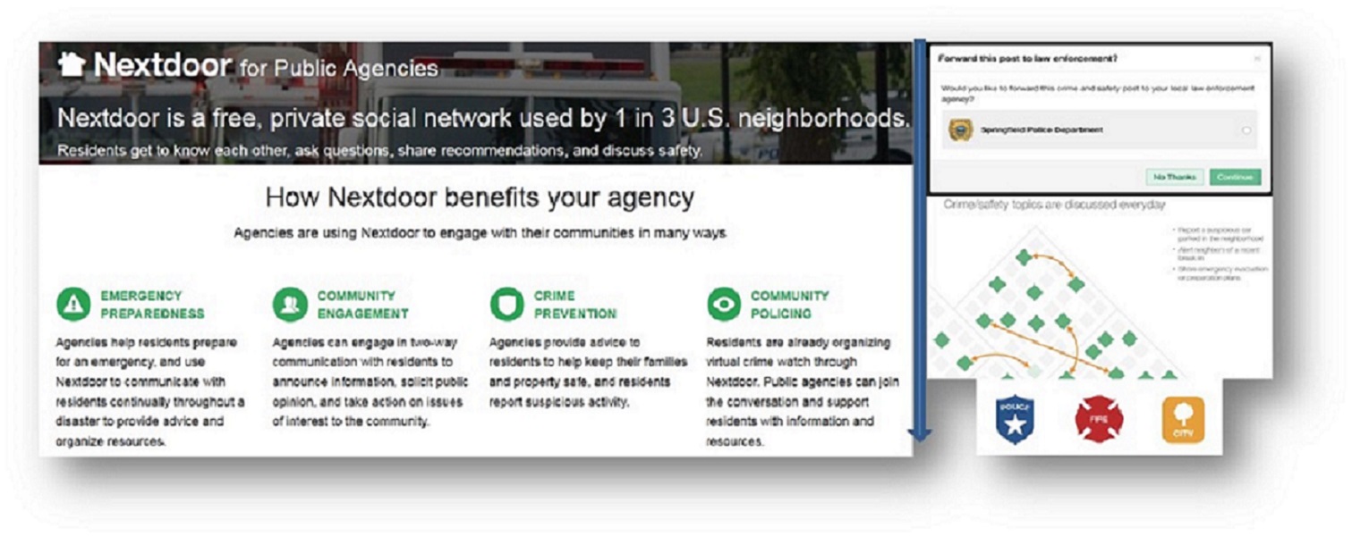 While most exchanges on Nextdoor do not involve crimes or safety (only 20% per a Q1 2015 Nextdoor report) the social network has experienced a significant upswing in police agency use for citizen engagement. More than 1,400 public agencies across the country collaborate with the social network as of the end of 2015. Updates can be posted to a police department’s entire service area, specific service areas (such as police precincts), or to individual neighborhoods. For instance as of December 2015 the Cambridge Police Department is using Nextdoor to establish two-way communication with Cambridge residents. More than 4,000 Cambridge Massachusetts residents were already using Nextdoor across 28 neighborhood groups to request a babysitters, ask for help finding lost animals, and report suspicious activities to one another.